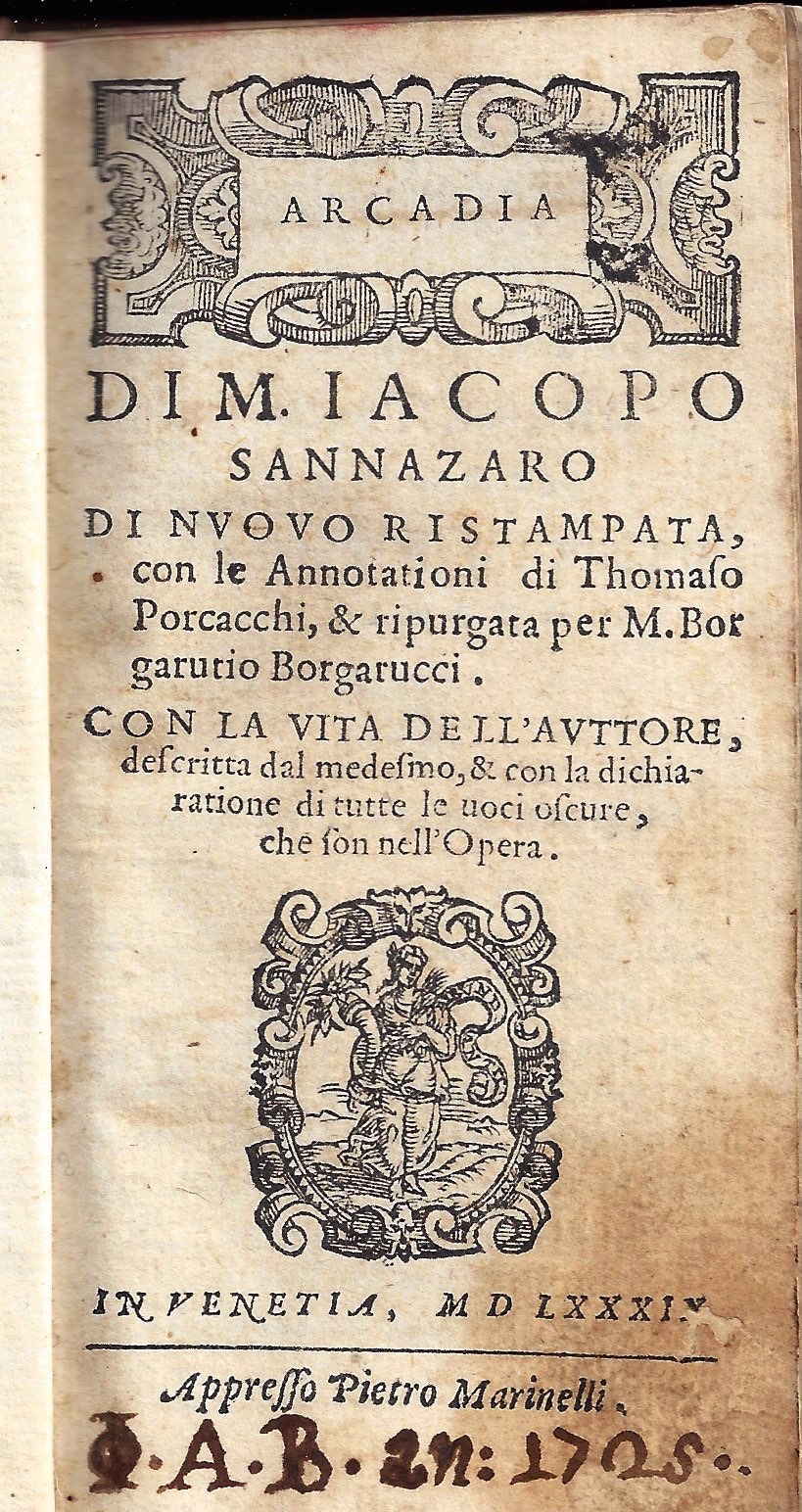 Arcadia di m. Iacopo Sannazaro di nuouo ristampata, con le annotazioni di Thomaso Porcacchi, & ripurgata per m. Borgarutio Borgarucci. Con la vita dell’auttore, descritta dal medesimo, & con la dichiaratione di tutte le uoci oscure, che son nell’o