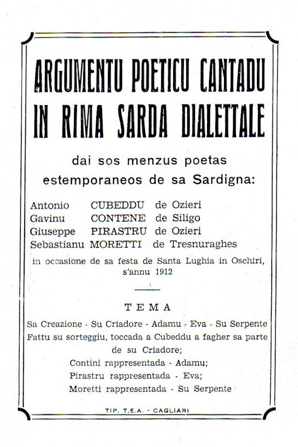 Argumentu poeticu cantadu in rima sarda dialettale dai sos menzus poetas estemporaneos de sa Sardigna: Antonio Cubeddu de Ozieri, Gavinu Contene de Siligo, Giuseppe Pirastru de Ozieri, Sebastianu Moretti de Tresnuraghes in occasione de sa festa de Santa L