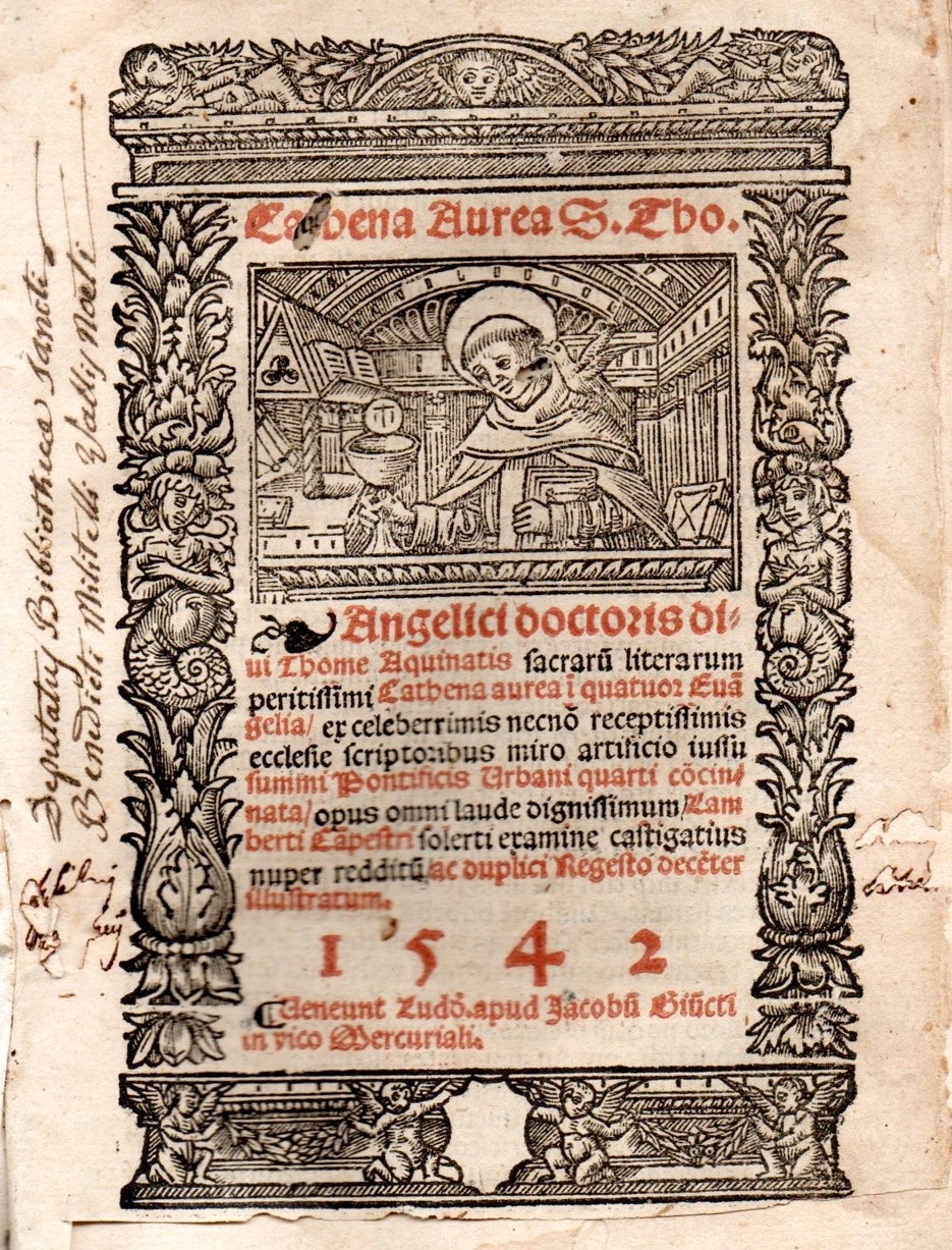 {Cathena aurea S. Tho. angelici doctoris diui Thome Aquinatis sacraru[m] literarum peritissimi Chatena aurea i[n] quatuor Eva[n]gelia….} 2: Venunt Lugd. : apud Jacobum Giuncti in vico Mercuriali, 1544 (Lugd. : impensis vero honesti viri Jacobi q. Franci