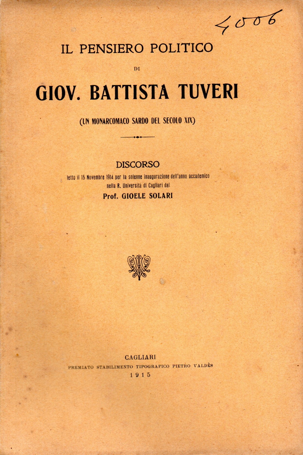 Il pensiero politico di Giov. Battista Tuveri, un monarcomaco sardo del secolo 19. : discorso letto il 15 novembre 1914 per la solenne inaugurazione dell’anno accademico nella R. Universita di Cagliari / dal prof. Gioele Solari