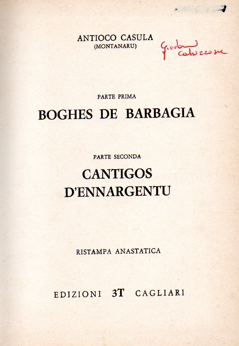 3 v. ; 21 cm. (Comprende: 1: Boghes de Barbagia ; Cantigos d’Ennargentu / Antioco Casula ; 2: Sos cantos de sa solitudine ; Sa lantia / Antioco Casula ; 3: Sas ultimas canzones ; Cantigos de amargura / Antioco Casula Montanaru ; poesie inedite a cura di F. Pilia e G. Porcu)