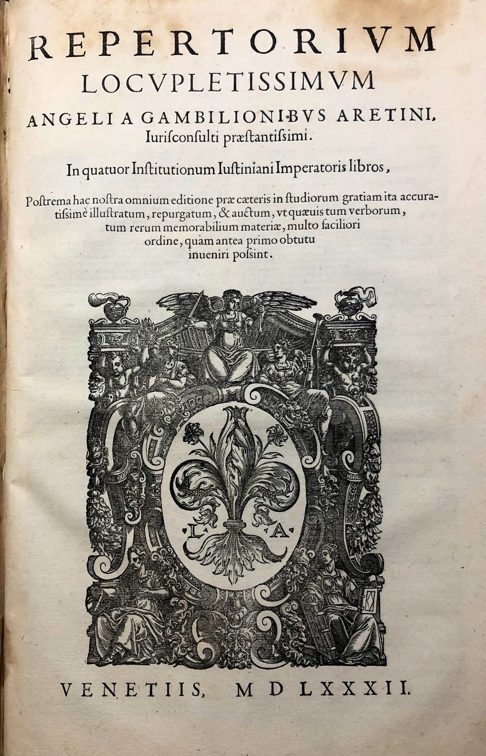 Repertorium locupletissimum Angeli a Gambilionibus Aretini, iurisconsulti praestantissimi. In quatuor institutionum iustiniani imperatoris libros, postrema hac nostra omnium editione … quam antea primo obtutu inueniri possint.