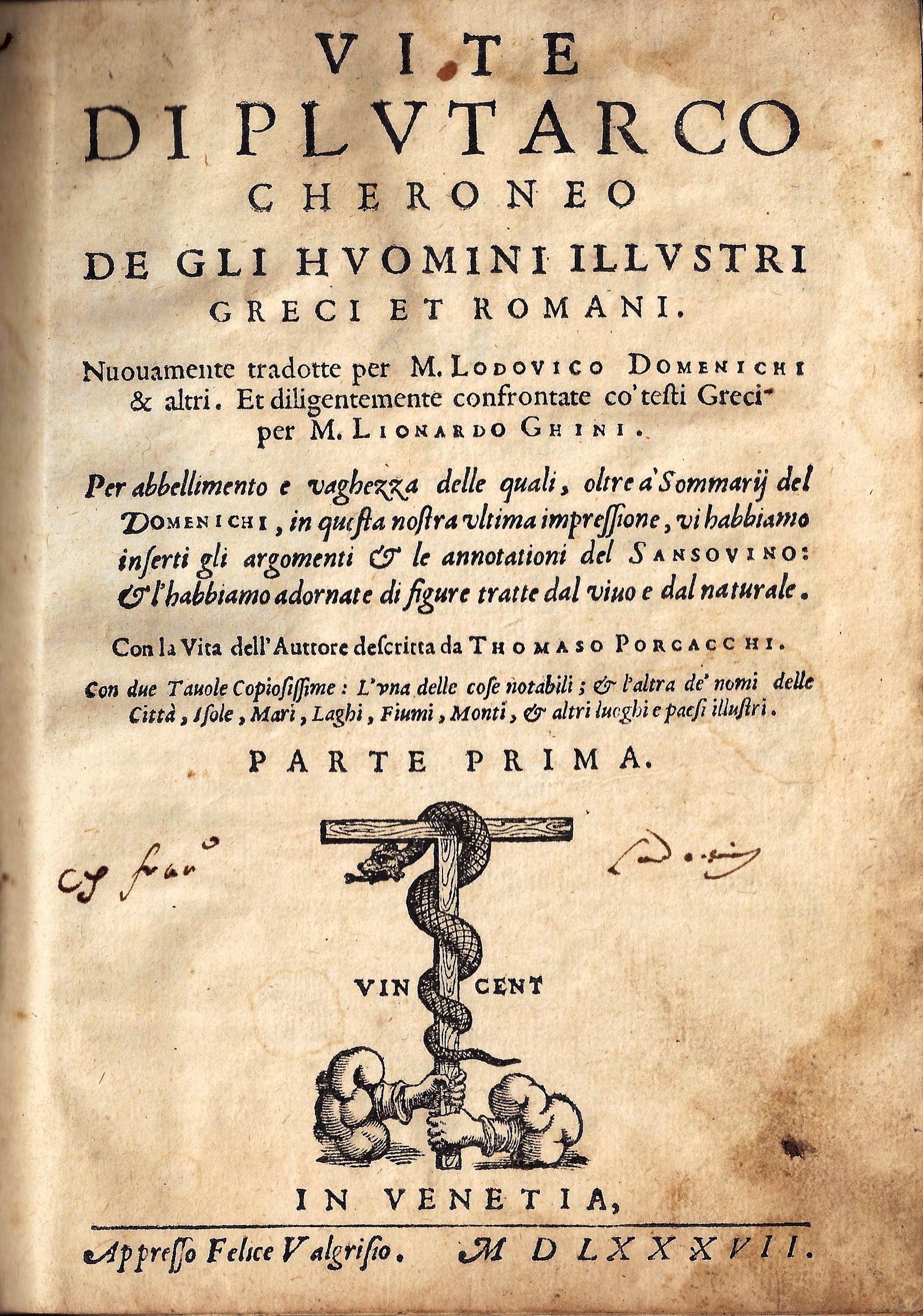 Vite di Plutarco Cheroneo de gli huomini illustri greci et romani. Nuouamente tradotte per m. Lodouico Domenichi & altri. Et diligentemente confrontate co’ testi greci per m. Lionardo Ghini. Per abbellimento e vaghezza delle quali … vi habbiamo inse